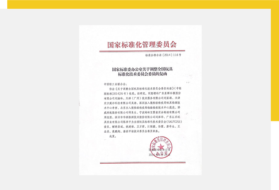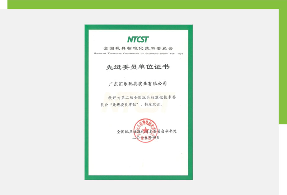 被评为全国玩具标准化技术委员会委员单位,并荣获“先进委员单位”称号。